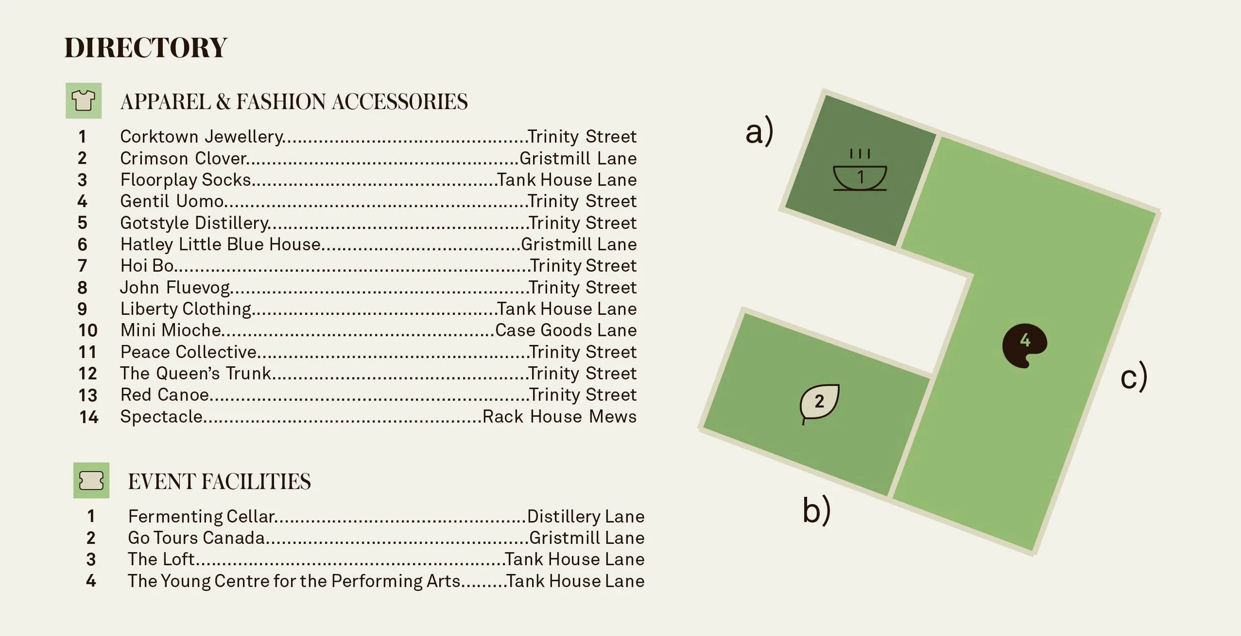 To improve accessibility, I moved away from traditional alphanumeric systems used in past Distillery District directories, opting instead for a custom system combining numbers with clear, category-specific icons. While color was used to guide the eye, the primarily monochromatic palette kept visual emphasis on structure and legibility. Categories like Apparel use icons (e.g. a shirt) paired with numbered locations, and all listings are alphabetized with street references for easier navigation. To ensure clarity, I tested multiple symbol designs with users, with the majority favoring the version that featured a consistent, neutral background.
